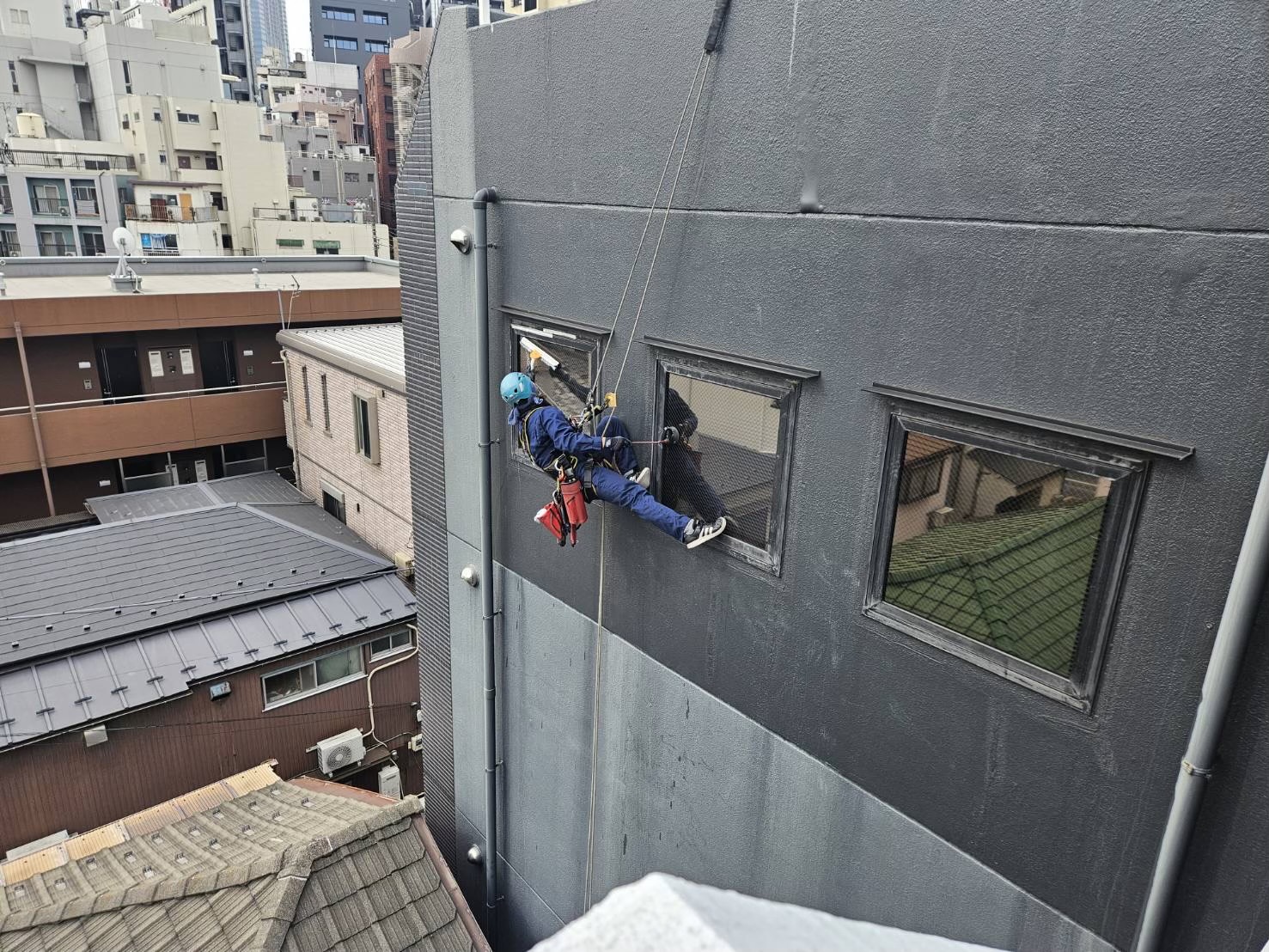 窓ガラス清掃・外壁清掃、特殊構造物の清掃・保守が主業務の清掃会社です。主にゴンドラとロープアクセスを用いて高層ビルの外面清掃を行っております。